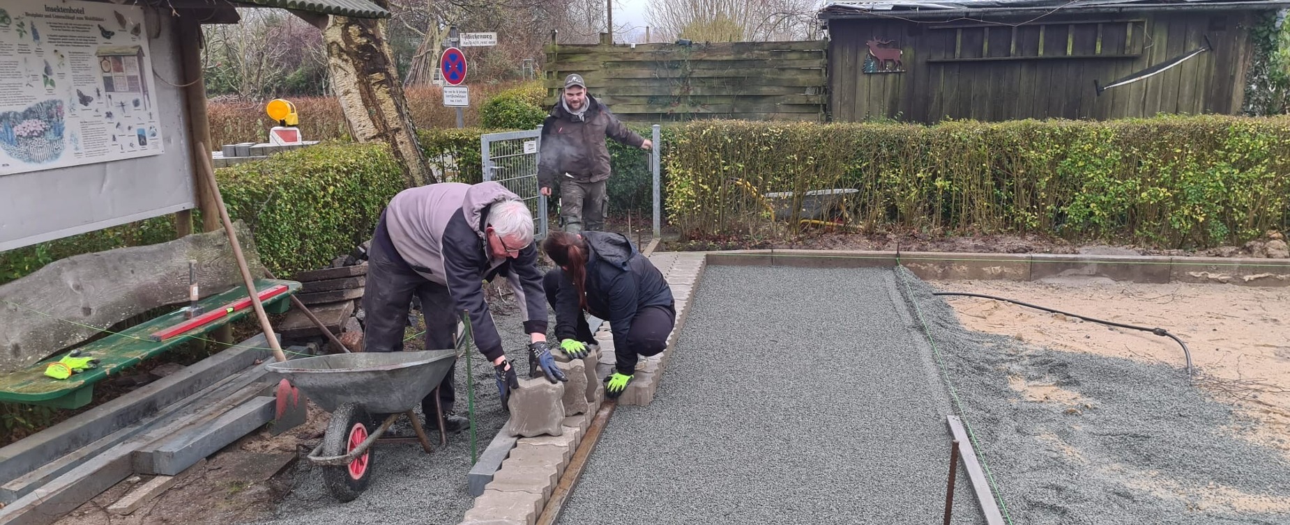 Der Lehrgarten "Erlebnis für Kids" ist Anfang März aus seinem Winterschlaf erwacht, und die Umbauarbeiten sind nahezu abgeschlossen! Dank der großzügigen Unterstützung von Sponsoren und Helfern konnte das Team um Marcel, Vivien, Jürgen und Mirko eine Vielzahl von Verbesserungen im Garten umsetzen. Eine neue Pflasterfläche für die Laube wurde geschaffen, und die Vorbereitung für den Schuppenanbau ist ebenfalls in vollem Gange. Darüber hinaus wurde die Grünanlage begradigt, eine Kräuterschnecke gebaut und die Schaukästen saniert.