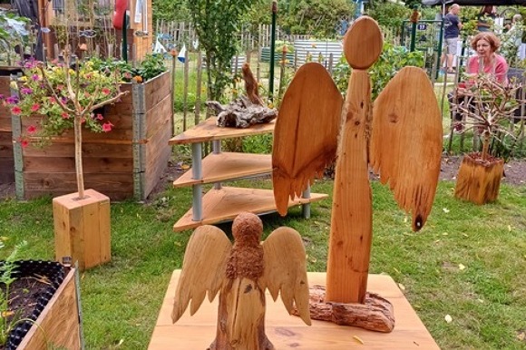 Ein buntes Angebot wurde präsentiert: nicht nur professionelle Künstlerinnen und Künstler stellten ihre Werke aus, so Reinald Szepanski, Ingeborg Szepanski, Wenzel Szepanski, Sarina Rick, Jana Simon, Malu und weitere waren mit von der Partie. Auch die Künstlerinnen und Künstler unserer Anlage stellten ihre schönen Werke vor, so zeigte Ronja Schrand ihre Miniaturen, Juliane Kruse ihre Patchworkarbeiten, Beate Kuchs ihre Glaskunst und Maria Will präsentierte die Keramik ihrer Mutter Roswitha. Für Kinder gab es auch ein besonderes Angebot, denn Dagmar Link hatte als erfahrene Pädagogin die Idee, die Herstellung von Frottagen anzuleiten. Unterstützt wurde sie dabei von Nurper Altan. Dieses Angebot wurde nicht nur von Kindern, sondern auch von deren Eltern gerne angenommen. Für die Letzteren eine kleine Reise in die eigene Kindheit.